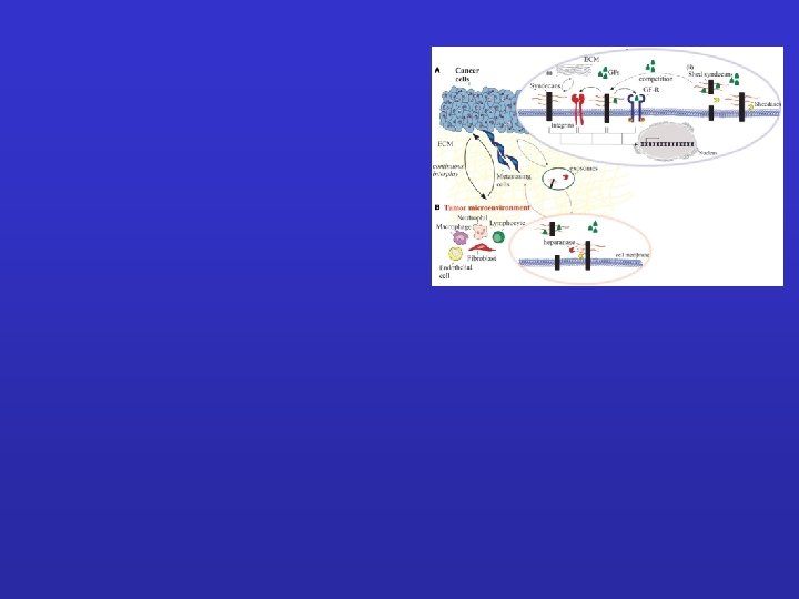 Cancer cells: (i) syndecans interact with various ECM macromolecules derived either from stromal cells or tumor cells. Such interactions lead to integrin-mediated altered functional properties such as cell proliferation, adhesion, migration, and invasion. On the other hand, transmembrane syndecans interact with growth factors (GFs) via their HS chains and subsequently act as co-receptors for the respective growth factor receptor (GF-R). In both cases, integrins can co-interact with these complexes and as a consequence to mediate different signaling pathways. (ii) Syndecan shedding is a process that involves the proteolytic cleavage of their ectodomain near the plasma membrane by sheddases. It is also reported that the shed syndecans compete with their transmembrane counterparts for soluble GFs. Shedding of syndecans contributes to cancer progression and especially to the crosstalk between the tumor cells and their host microenvironment. Exosomes, extracellular vesicles that are secreted in high amounts in tumors, retain both heparanase and syndecan-1 as cargo within exosomes and subsequently influence not only the behavior of the tumor microenvironment within the tumor niche and distant sites, but also the growth of the metastasizing cells. (B) Tumor microenvironment. Heparanase plays a distinct role in the shedding of syndecans by cleaving HS chains promoting the shedding via sheddases. This action results in induced tumor growth, angiogenesis and metastasis.