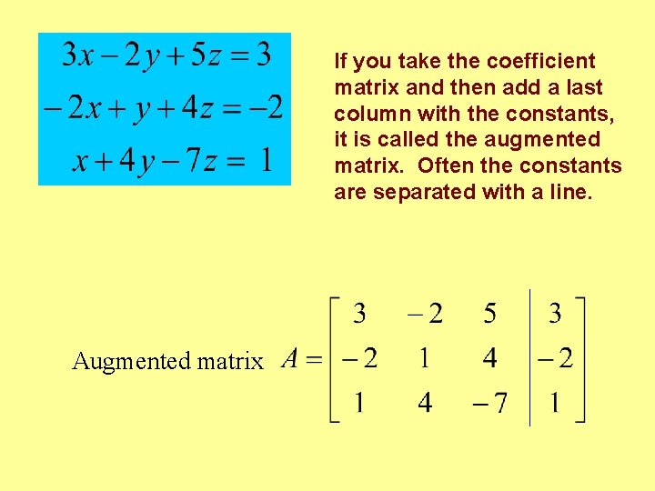 If you take the coefficient matrix and then add a last column with the constants, it is called the augmented matrix. Often the constants are separated with a line. Augmented matrix