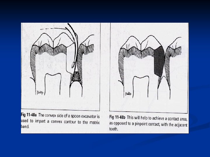 PURPOSE OF MATRIX BAND 1. Act as a temporary wall. 2. Re-establishment of contact. 3. Restrict extrusion of the restorative material and prevents overhangs. 4. Provide physiologic contour for proximal surface of restoration. 5. Assist in holding back gingiva & rubber dam during restoration. 6. Maintain the form of restoration during hardening