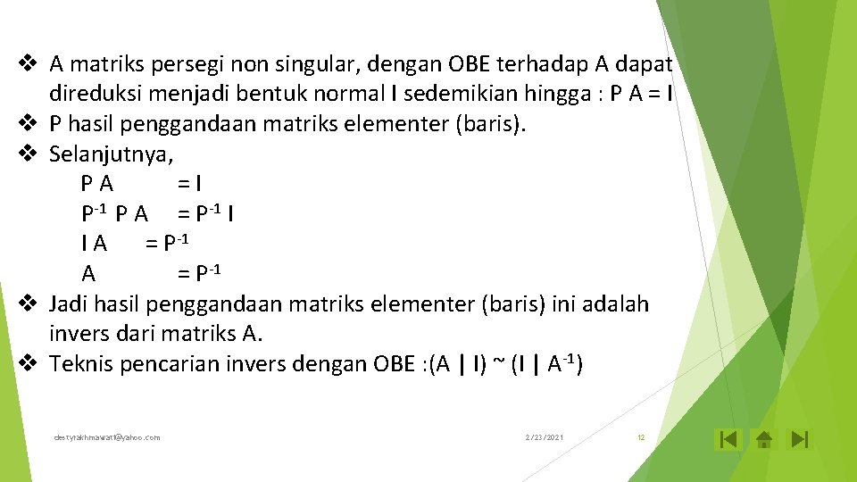 v A matriks persegi non singular, dengan OBE terhadap A dapat direduksi menjadi bentuk normal I sedemikian hingga : P A = I v P hasil penggandaan matriks elementer (baris). v Selanjutnya, PA =I P-1 P A = P-1 I IA = P-1 v Jadi hasil penggandaan matriks elementer (baris) ini adalah invers dari matriks A. v Teknis pencarian invers dengan OBE : (A | I) ~ (I | A-1) destyrakhmawati@yahoo. com 2/23/2021 12