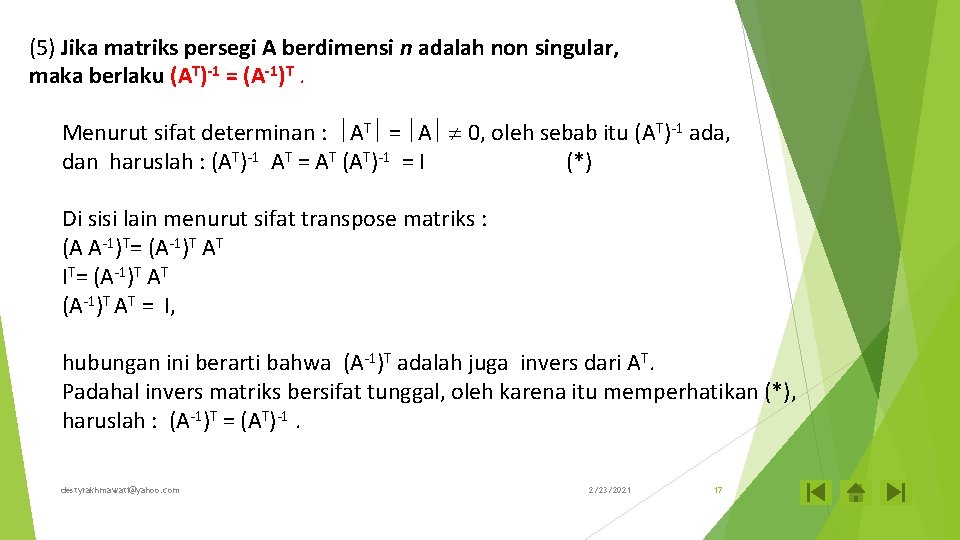 (3) Matriks invers bersifat nonsingular (determinannya tidak nol ) det (A A-1) = det (A) det (A-1) det (I) = det (A) det (A-1) 1 = det (A) det (A-1) ; karena det (A) 0 , maka : det (A-1) = (4) Jika A dan B masing-masing adalah matriks persegi berdimensi n, dan berturut-turut A-1 dan B-1 adalah invers dari A dan B, maka berlaku hubungan : (AB)-1 = B-1 A-1 di sisi lain : (AB)-1 (AB) (B-1 A-1) (AB) = (AB)-1 (AB) = A(BB-1) A-1 = B-1(A-1 A) B =I = A I A-1 = B-1 I B = A A-1 = I = B-1 B = I Menurut sifat (1) di atas matriks invers bersifat uniqe (tunggal), karena itu dari (*) dan (**) dapatlah disimpulkan bahwa (AB)-1 = B-1 A-1. destyrakhmawati@yahoo. com 2/23/2021 16 (*) (**)
