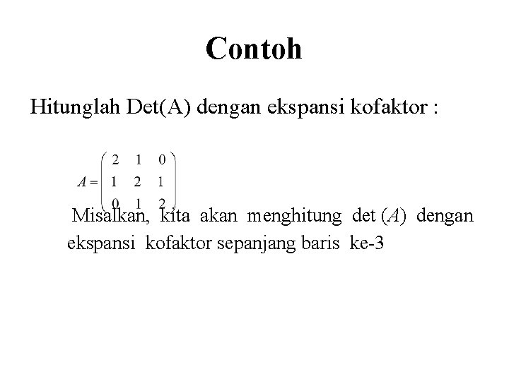 Contoh Hitunglah Det(A) dengan ekspansi kofaktor : Misalkan, kita akan menghitung det (A) dengan ekspansi kofaktor sepanjang baris ke-3
