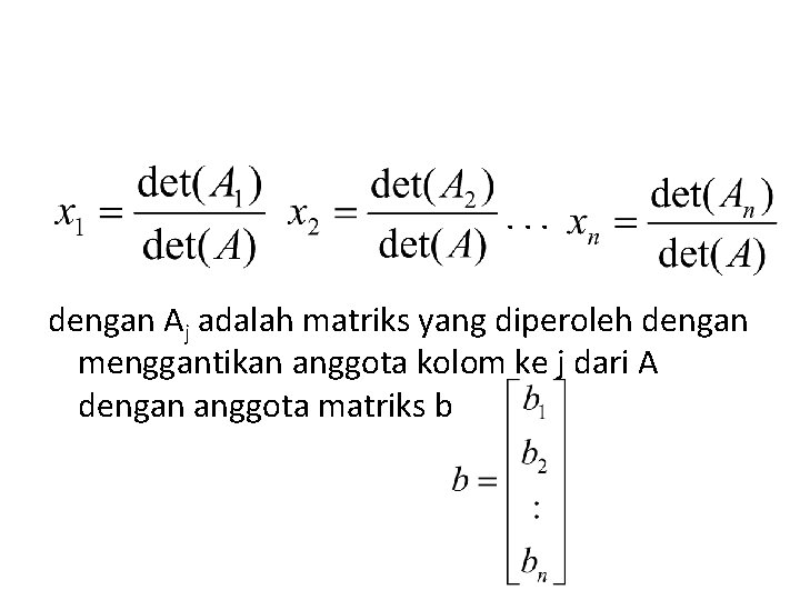 . . . dengan Aj adalah matriks yang diperoleh dengan menggantikan anggota kolom ke j dari A dengan anggota matriks b