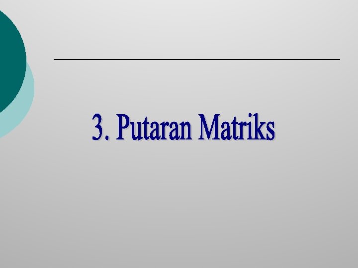 Putaran Matriks Putaran Hasil Kali Matriks Putaran hasilkali dua matriks sama dengan hasil kali putaran masing-masing dengan urutan yang dibalik. Hal ini telah kita lihat pada putaran hasil kali vektor baris dan vektor kolom. Jika dan maka Dengan demikian maka