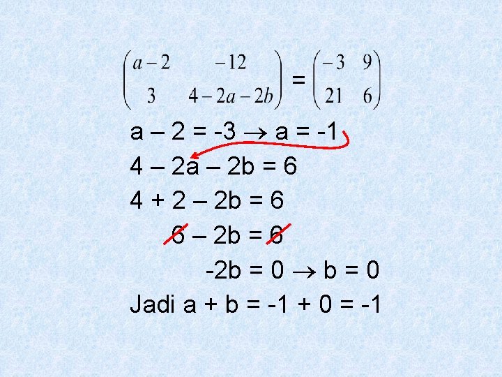Contoh 2: Matriks A = , B= dan C = Jika A – 2 B = 3 C, maka a + b = ….