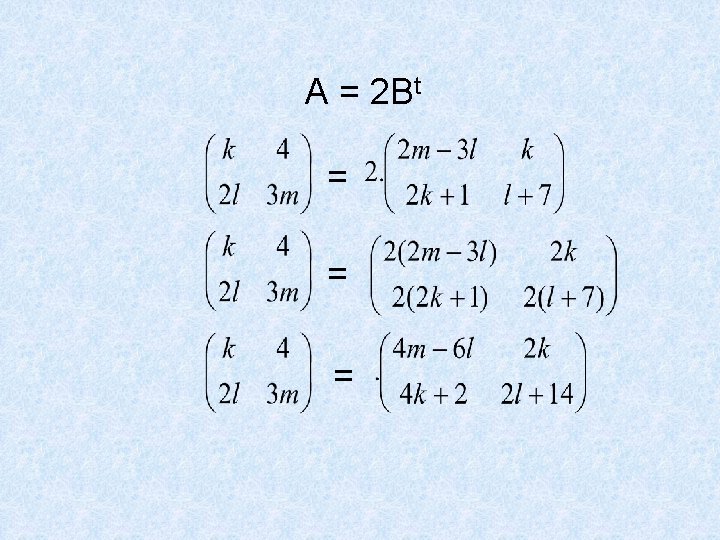 Contoh 3: Matriks A = dan B = Supaya dipenuhi A = 2 Bt, dengan Bt adalah matriks transpos dari B maka nilai m = ….