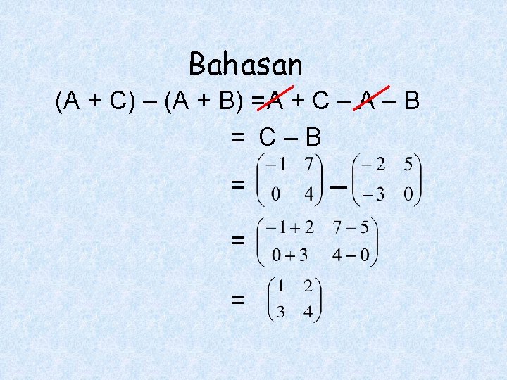 Contoh 2: Jika A = , B= dan C = Maka (A + C) – (A + B) =….