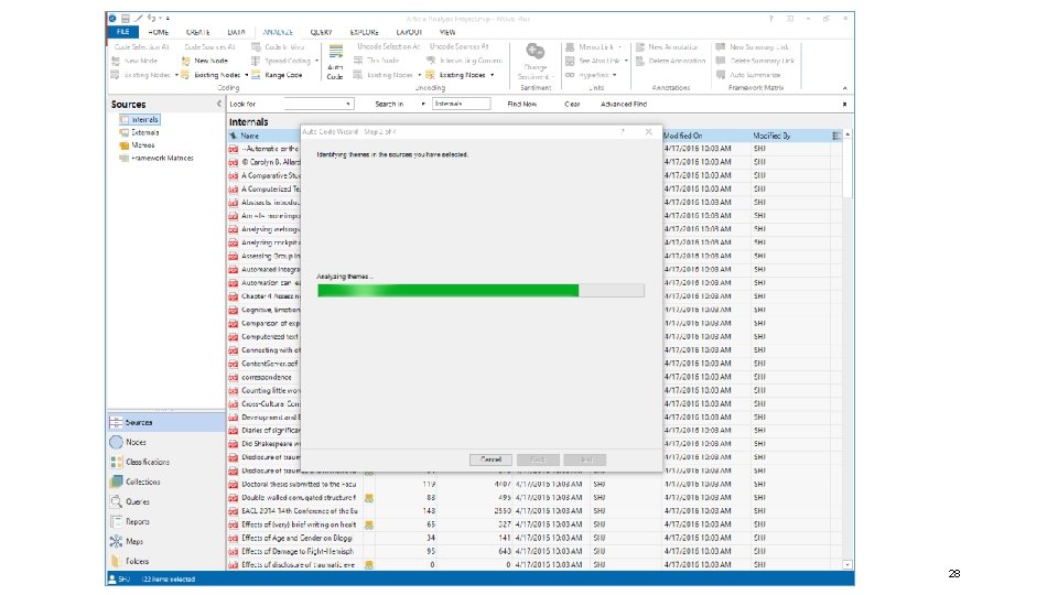 PATHS USED TO CONDUCT AUTO CODING RESULTING IN INTENSITY DATA MATRICES (IN NVIVO 12 PLUS) Theme and subtheme extraction / topic modeling Highlight source. (You can use CTRL + A to select all in a folder. ) In ribbon, select Analyze tab. Click Auto Code Button. Select “Identify themes…” Proceed with the Auto Code Wizard… Sentiment extraction Highlight source. (You can use CTRL + A to select all in a folder. ) In ribbon, select Analyze tab. Click Auto Code Button. Select “Identify sentiment…” Proceed with the Auto Code Wizard… 27