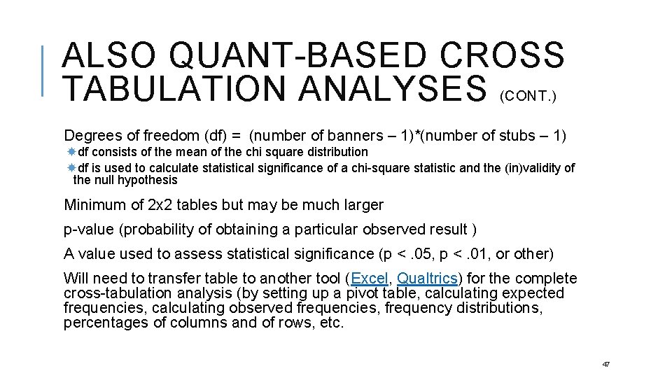 ALSO QUANT-BASED CROSS TABULATION ANALYSES (CONT. ) Degrees of freedom (df) = (number of banners – 1)*(number of stubs – 1) df consists of the mean of the chi square distribution df is used to calculate statistical significance of a chi-square statistic and the (in)validity of the null hypothesis Minimum of 2 x 2 tables but may be much larger p-value (probability of obtaining a particular observed result ) A value used to assess statistical significance (p <. 05, p <. 01, or other) Will need to transfer table to another tool (Excel, Qualtrics) for the complete cross-tabulation analysis (by setting up a pivot table, calculating expected frequencies, calculating observed frequencies, frequency distributions, percentages of columns and of rows, etc. 47