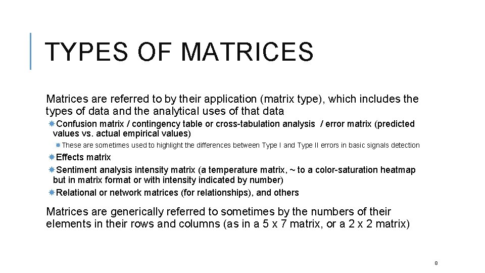 TYPES OF MATRICES Matrices are referred to by their application (matrix type), which includes the types of data and the analytical uses of that data Confusion matrix / contingency table or cross-tabulation analysis / error matrix (predicted values vs. actual empirical values) These are sometimes used to highlight the differences between Type I and Type II errors in basic signals detection Effects matrix Sentiment analysis intensity matrix (a temperature matrix, ~ to a color-saturation heatmap but in matrix format or with intensity indicated by number) Relational or network matrices (for relationships), and others Matrices are generically referred to sometimes by the numbers of their elements in their rows and columns (as in a 5 x 7 matrix, or a 2 x 2 matrix) 8