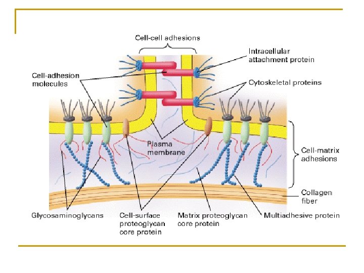 Receptores de adhesión n Receptores para proteínas o carbohidrates que tienen principalmente un papel estructural mas que de señalización n Célula-substrato Célula-célula n