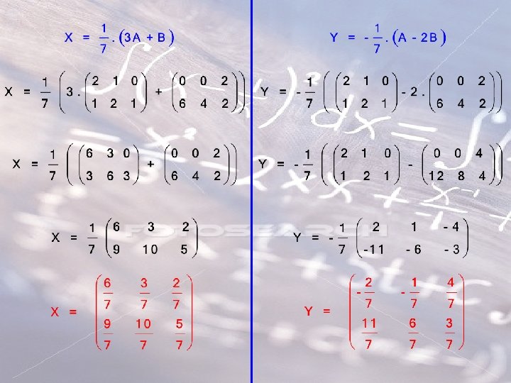 7. EXERCÍCIO DADAS AS MATRIZES: DETERMINE AS MATRIZES X E Y TAIS QUE: SOLUÇÃO SUBSTITUINDO O VALOR DE Y NA PRIMEIRA EQUAÇÃO RESULTA: