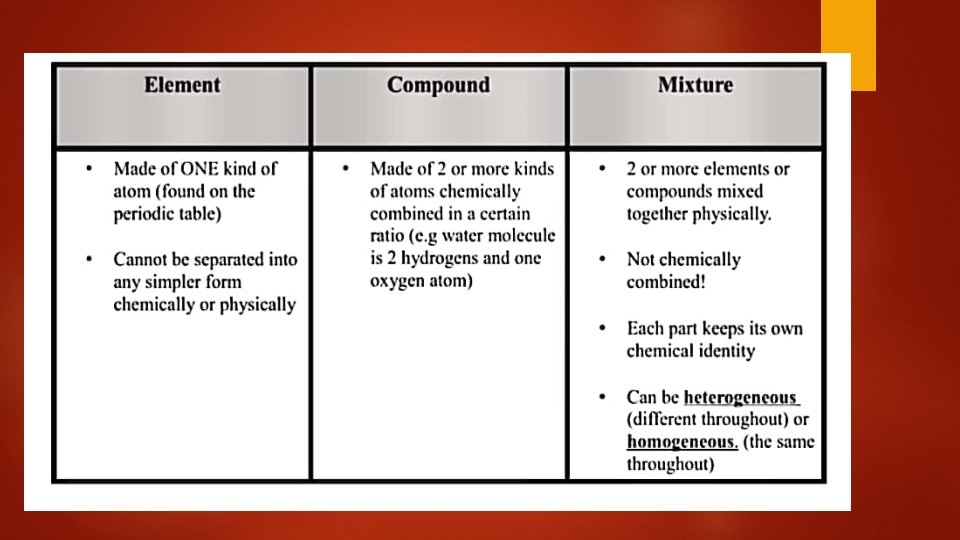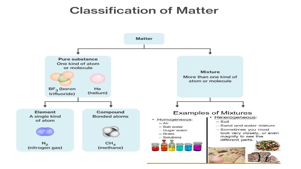 Mixtures are two kinds: • Heterogeneous = different throughout. • Homogeneous = same through out.