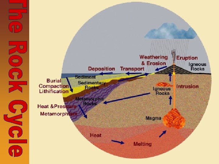 The Rock Cycle • Rock Cycle- Diagram used to illustrate how and why the three types of rocks are related to each other • Summarizes the processes responsible for the formation and breakdown of igneous, sedimentary, and metamorphic rocks • Rocks go through changes due to cooling, weathering, compaction, heat & pressure, and melting