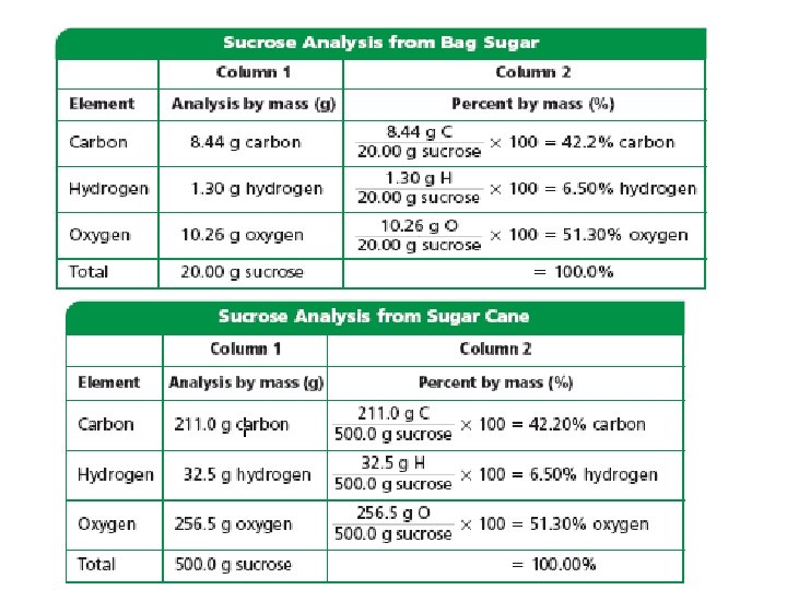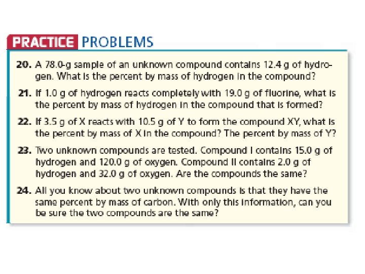 The Law of Definite Proportions • The Law of Definite Proportions- a compound is always composed of the same elements in the same proportions. • Percent by mass (%) = mass of element ÷ mass of compound X 100