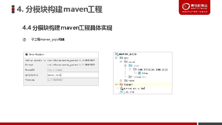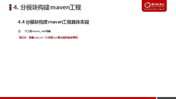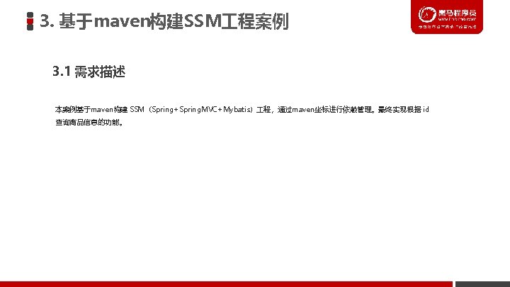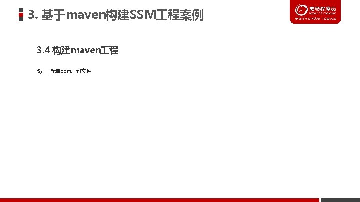 3. 基于maven构建SSM 程案例 3. 2 实现步骤分析 2. maven项目构建 ① 创建maven web项目 ② 配置pom. xml文件 ③ 实现spring+mybatis整合 l 创建POJO类 l 持久层DAO接口编写 l Mapper映射文件编写 l 业务层Service编写 l spring配置文件application. Context-dao. xml编写 l spring配置文件application. Context-service. xml编写 ④ 加入springmvc相关配置 l 表现层Controller编写 l springmvc. xml文件编写 l jsp页面编写 l 配置web. xml文件