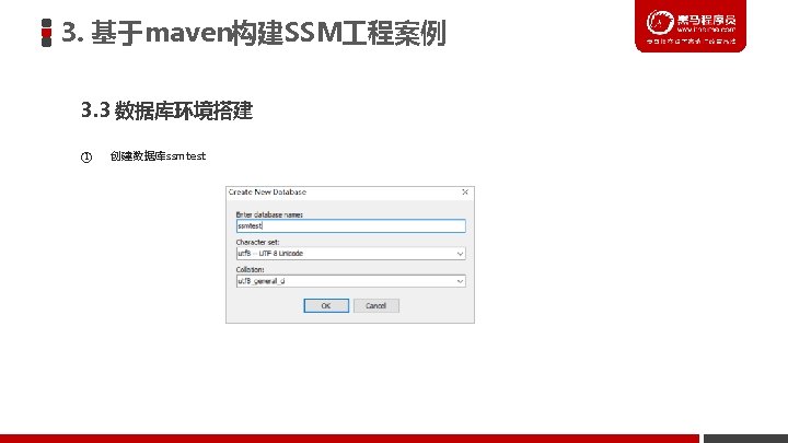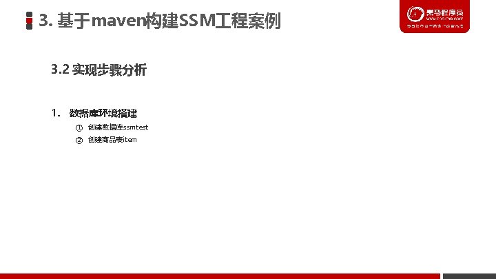 3. 基于maven构建SSM 程案例 3. 3 数据库环境搭建 ② 在数据库中创建表 CREATE TABLE `item` ( `id` int(11) NOT NULL auto_increment, `name` varchar(255) default NULL, `price` float default NULL, `createtime` datetime default NULL, `detail` varchar(255) default NULL, PRIMARY KEY (`id`) ) ENGINE=Inno. DB DEFAULT CHARSET=utf 8
