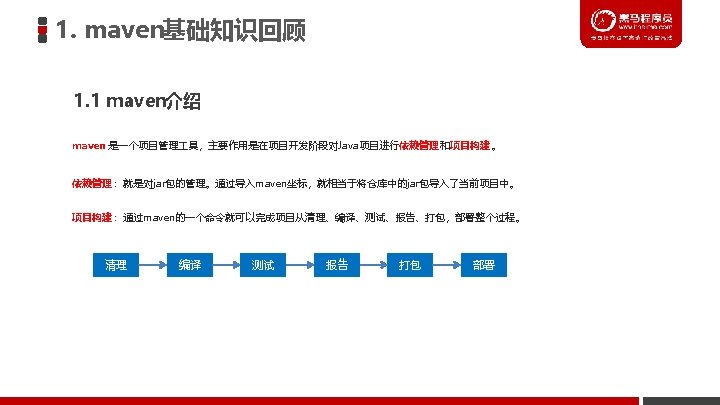 1. maven基础知识回顾 1. 3 maven常用命令 l clean:清理 l compile:编译 l test:测试 l package:打包 l install:安装