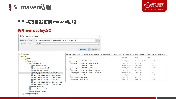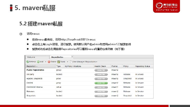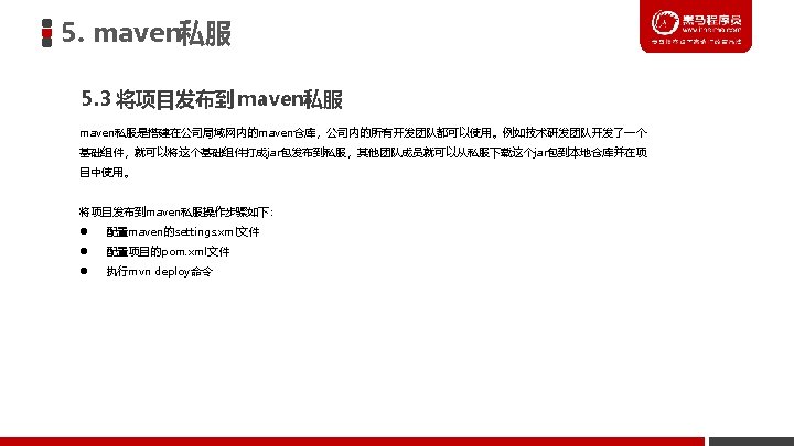 5. maven私服 5. 4 配置项目的 pom. xml文件 <distribution. Management> <repository> <id>releases</id> <url>http: //localhost: 8081/nexus/content/repositories/releases/</url> </repository> 1 <snapshot. Repository> <id>snapshots</id> <url>http: //localhost: 8081/nexus/content/repositories/snapshots/</url> </snapshot. Repository> </distribution. Management> 注意:pom. xml文件的<id>的值和前面配置的settings. xml 文件的<id>值需要一致