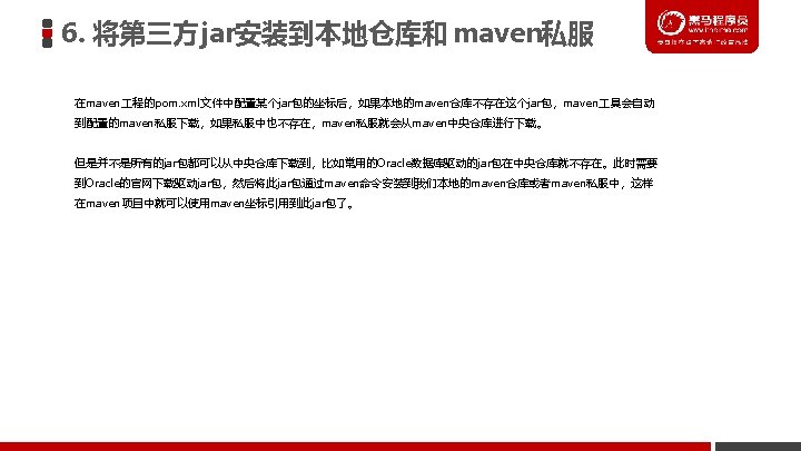 6. 将第三方jar安装到本地仓库和 maven私服 6. 2 将第三方jar安装到maven私服 ① 下载Oracle的jar包(略) ② 在maven的settings. xml配置文件中配置第三方仓库的server信息 <server> <id>thirdparty</id> <username>admin</username> <password>admin 123</password> </server> ③ 执行mvn deploy命令进行安装 mvn deploy: deploy-file -Dfile=ojdbc 14 -10. 2. 0. 4. 0. jar -Dgroup. Id=com. oracle -Dartifact. Id=ojdbc 14 – Dversion=10. 2. 0. 4. 0 -Dpackaging=jar – Durl=http: //localhost: 8081/nexus/content/repositories/thirdparty/ -Drepository. Id=thirdparty