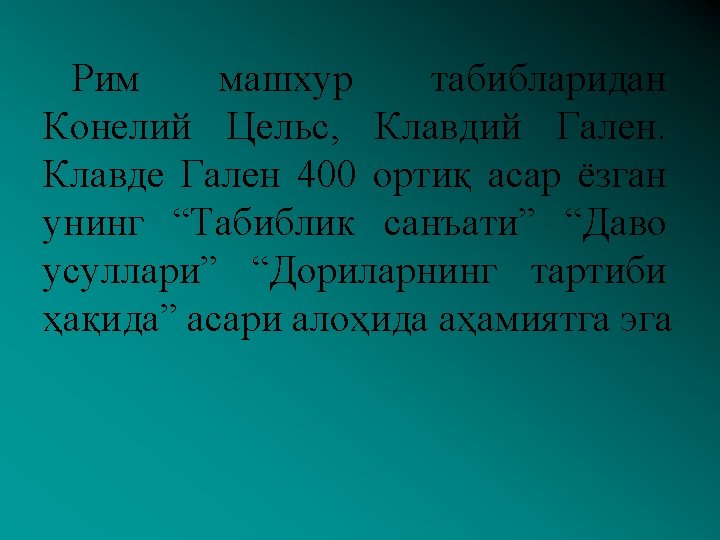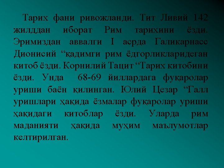 ANTIK RIM MADANIYATI Antik rim madaniyati er. avv. VIII asredan 476 yiligacha davom etgan. Qadimgi Italiyada va butun Rim saltanatida madaniyat sohasida katta yutuqlar qo`lga kiritilgan. Yozuv ilmiy bilimlarning eng muhim ko`rinishi sifatida miloddan avvalgi I ming yillik boshlaridan boshlab yuzaga kelgan. Finikiya alifbosi Finikiya yozuvi