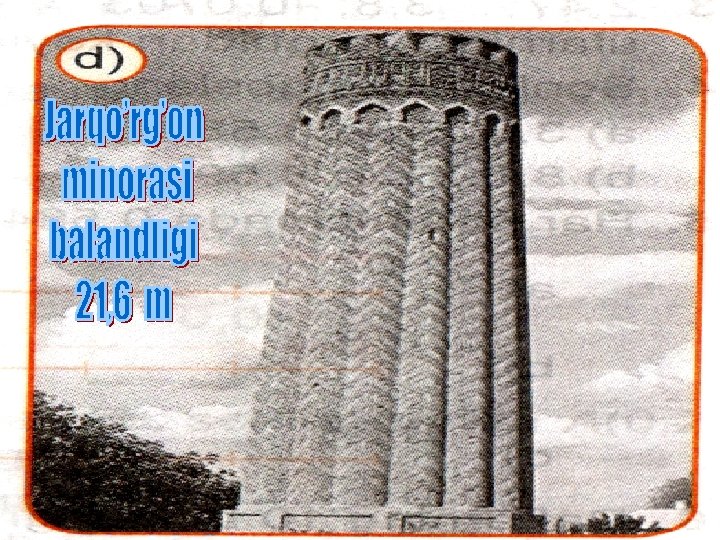 Mustaqil ish Darslikdagi 21 -masala. Vatanimiz qadimiy yodgorliklarga boy. Quyidagi rasmlarda Respublikamizning turli viloyatlaridagi minoralar keltirilgan. Bu minoralarning balandliklarini kamayib borish tartibida joylashtiring.