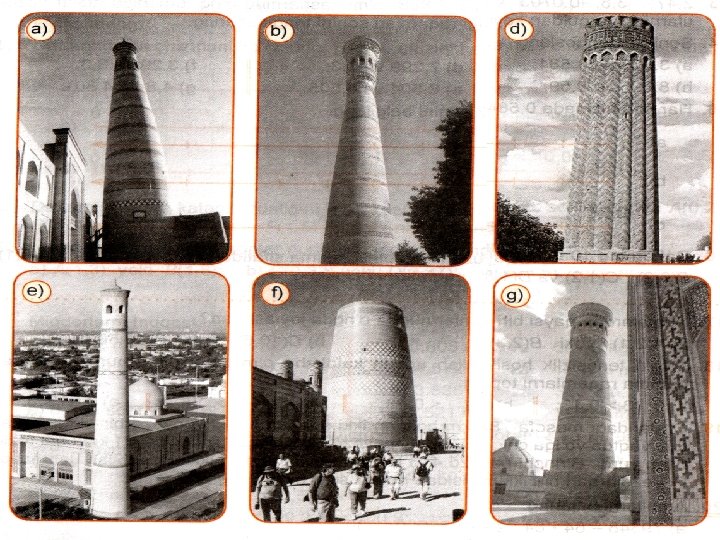 a) Xiva shahridagi Islom Xo’ja minorasi balandligi 44, 5 m Buxoro shahridagi “Minorai-kalon” balandligi 45. 5 m
