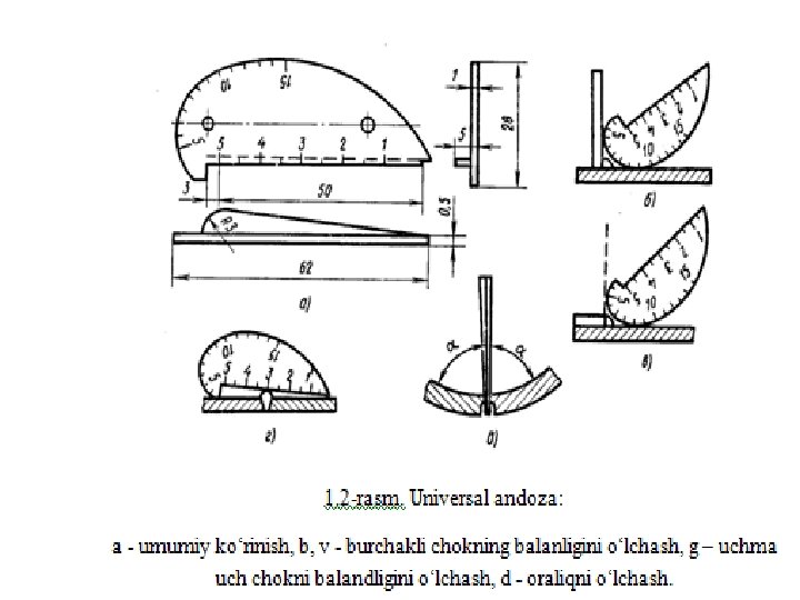 • Yuqorida ko‘rsatiligan parametrlarni o‘lchash va tekshirish uchun maxsus andozalar yoki universal asbob (1. 1 -rasm) qo‘llaniladi. Texnik shart yoki belgilangan texnologik jarayondan chetga chiqib payvandlashga yig‘ilgan detallar, uzellar yoki buyumlar brakka chiqariladi. Nazorat qilish vositalari, tartibi va metodikasi ishlab chiqarishning texnologik jarayonida ko‘zda tutiladi.