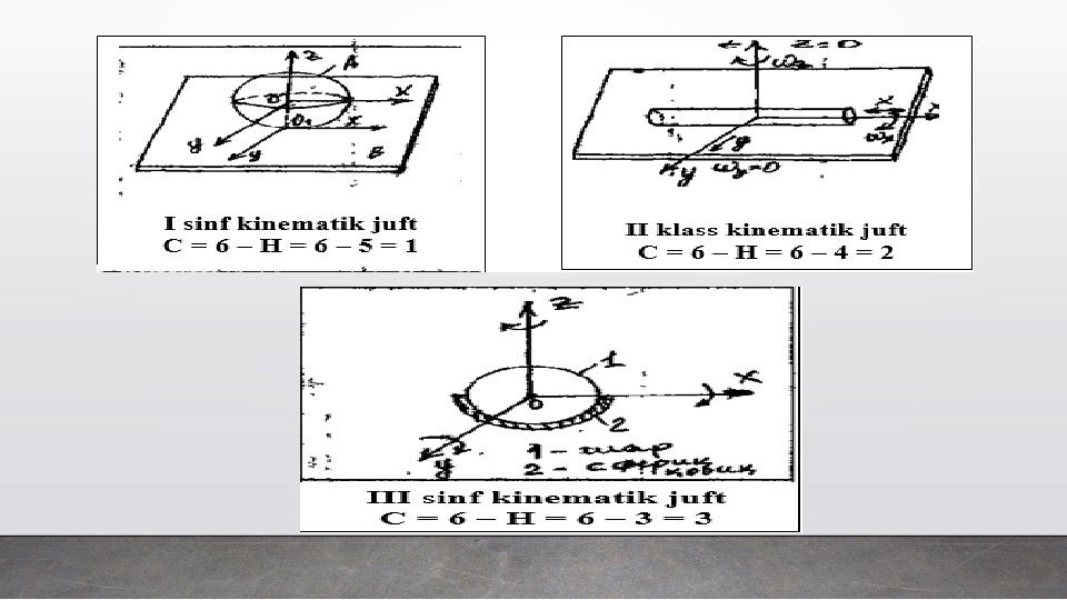 Uchinchi klass kinematik juftda zvenoga uchta bog’lanish qo’yilib va boshqa zvenoga nisbatan uchta harakat qilishi mumkin. Bunday juftlardan – sferali yoki sharovoy sharnir. Zvenoning yuqorisidagi shar, tablitsada ko’rsatilganidek, pastdagi zvenoning ichki sferasiga kiradi. Konstruktsiya buyicha istalgancha tayyorlanishi mumkin, printsip bo’yicha shunday. Yuqoridagi zveno uchta dekart o’qlari atrofida aylanishi mumkin. Turtinchi klas kinematik juft to’rtta bog’lanish qo’yib, zvenoga ikkita harakatchanlikni qoldiradi. Bulardan biri – tsilindrik. Konstruktiv bu jadvaldagi rasmda ko’rsatilgandek tasvirlangan – yumaloq sterjen richagning tsilindrik teshikchasiga kirgizilgan. Richag tsilindrik teshikcha bo’ylab siljiydi va uning atrofida aylanadi. Beshinchi klass kinematik juft zvenoga beshta bog’lanish qo’yib, bitta harakatchanlikni qoldiradi. Bulardan tablitsada ikki xili ko’rsatilgan – ilgarilanma va aylanma. Ilgarilanma juftlarning konstruktiv bajarilishi tablitsada ko’rsatilganidek, prizmatik yunalishda ikki zvenoning bog’lanishi, natijada bir zveno boshqasiga bitta harakat beradi. (misol, metalga ishlov beruvchi stanoklarning yunaltiruvchisi).