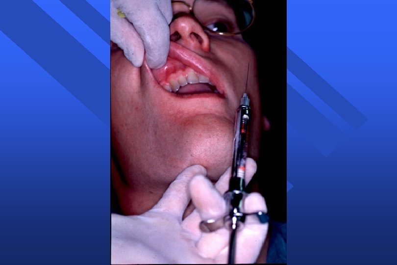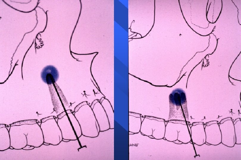 Technique Apply topical Landmarks - mucobuccal fold long axis of tooth Insert needle at height of mucobuccal fold Target area - apex of tooth Aspirate, deposit approx. 0. 6 -1 ml solution