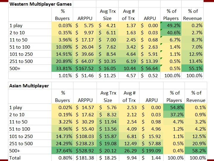 ARPU & ARPPU • ARPPUs for single-player games cluster around $5 -$10 • Multiplayer games range $20 -$350 • • Average ARPPU for a multiplayer game from Asia: $181 Average for Western multiplayer game: $51 Only 9 Western games have an ARPPU above $100 ARPPU is the main factor in high ARPU for Asian games, important factor for all games