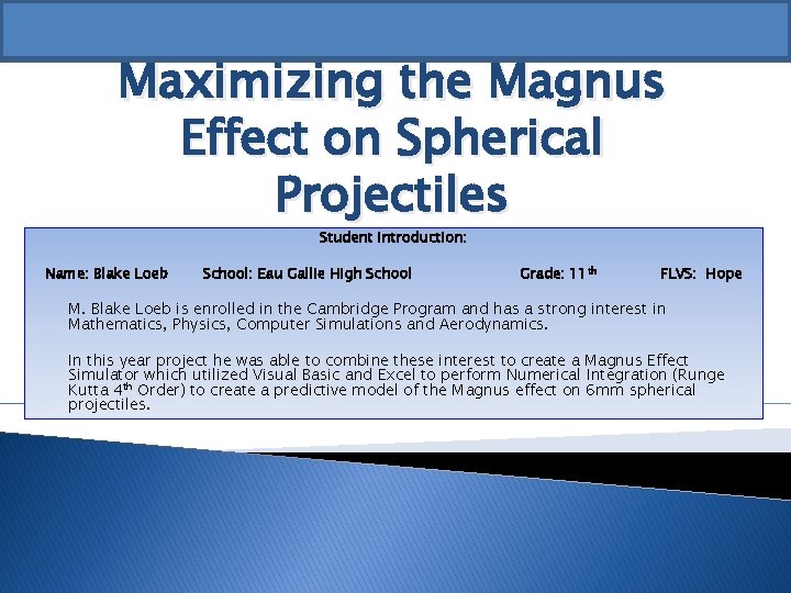 Maximizing the Magnus Effect on Spherical Projectiles Student Introduction: Name: Blake Loeb School: Eau Gallie High School Grade: 11 th FLVS: Hope M. Blake Loeb is enrolled in the Cambridge Program and has a strong interest in Mathematics, Physics, Computer Simulations and Aerodynamics. In this year project he was able to combine these interest to create a Magnus Effect Simulator which utilized Visual Basic and Excel to perform Numerical Integration (Runge Kutta 4 th Order) to create a predictive model of the Magnus effect on 6 mm spherical projectiles.