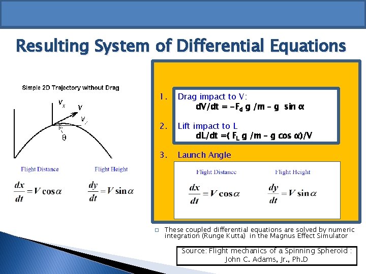 Resulting System of Differential Equations � 1. Drag impact to V: d. V/dt = -Fd g /m – g sin α 2. Lift impact to L d. L/dt =( FL g /m – g cos α)/V 3. Launch Angle These coupled differential equations are solved by numeric integration (Runge Kutta) in the Magnus Effect Simulator Source: Flight mechanics of a Spinning Spheroid : John C. Adams, Jr. , Ph. D