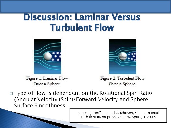 Discussion: Laminar Versus Turbulent Flow � Type of flow is dependent on the Rotational Spin Ratio (Angular Velocity (Spin)/Forward Velocity and Sphere Surface Smoothness Source: J. Hoffman and C. Johnson, Computational Turbulent Incompressible Flow, Springer 2007.