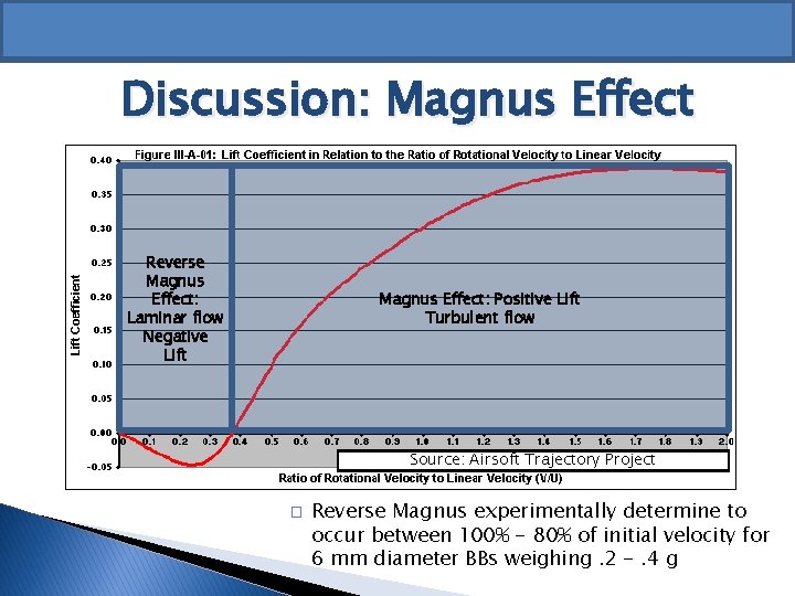 Discussion: Magnus Effect Reverse Magnus Effect: Laminar flow Negative Lift Magnus Effect: Positive Lift Turbulent flow Source: Airsoft Trajectory Project � Reverse Magnus experimentally determine to occur between 100% - 80% of initial velocity for 6 mm diameter BBs weighing. 2 -. 4 g