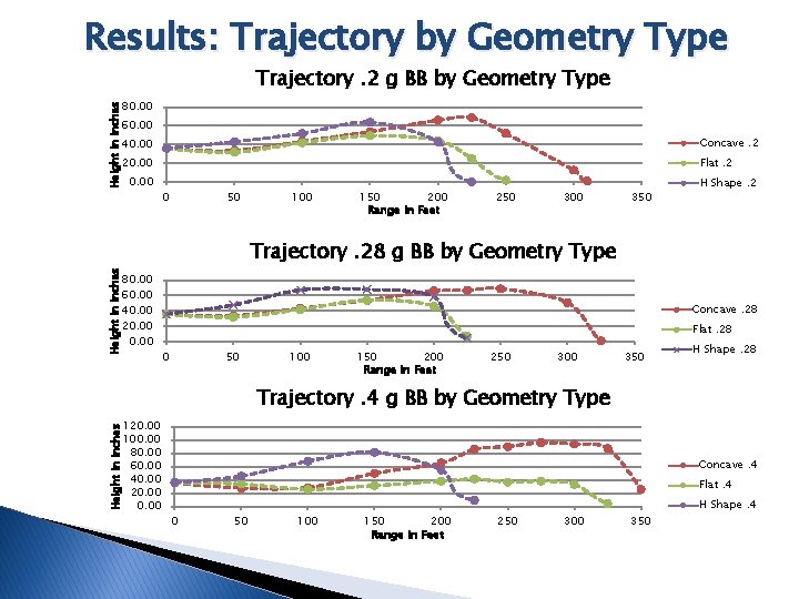 Results: Trajectory by Geometry Type Trajectory. 2 g BB by Geometry Type Height in Inches 80. 00 60. 00 40. 00 Concave. 2 20. 00 Flat. 2 0. 00 0 50 100 150 200 Range in Feet 250 300 350 H Shape. 2 Height in Inches Trajectory. 28 g BB by Geometry Type 80. 00 60. 00 40. 00 20. 00 Concave. 28 Flat. 28 0 50 100 150 200 Range in Feet 250 300 350 H Shape. 28 Trajectory. 4 g BB by Geometry Type Height in Inches 120. 00 100. 00 80. 00 60. 00 40. 00 20. 00 Concave. 4 Flat. 4 0 50 100 150 200 Range in Feet 250 300 350 H Shape. 4