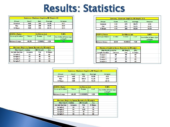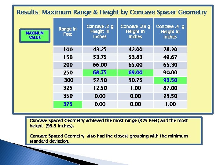 Results: Maximum Range & Height by Concave Spacer Geometry MAXIMUM VALUE Range in Feet Concave. 2 g Height in inches Concave. 28 g Height in inches Concave. 4 g Height in inches 100 43. 25 42. 00 28. 20 150 53. 75 Japa 53. 83 49. 67 66. 00 65. 30 250 68. 75 69. 00 90. 00 300 52. 50 50. 75 93. 50 325 12. 50 1. 00 87. 00 350 0. 00 25. 50 375 0. 00 1. 00 200 Concave Spaced Geometry achieved the most range (375 Feet) and the most height (93. 5 inches). Concave Spaced Geometry also had the closest grouping with the minimum standard deviation.