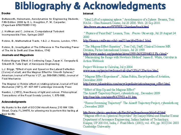 Books Bibliography & Acknowledgments Butterworth, Heinemann, Aerodynamics for Engineering Students, Fifth Edition 2008 by E. L. Houghton, P. W. Carpenter. (Paperback 9780750651110) J. Hoffman and C. Johnson, Computational Turbulent Incompressible Flow, Springer 2007 Robins, B. , Mathematical Tracts, 1 & 2. J. Nourse, London, 1761. Robins, B. , Investigation of The Difference in The Resisting Power of The Air to Swift and Slow Motion, 1742 Journals and Magazines Robins-Magnus Effect: A Continuing Saga. , Tapan K. Sengupta & Srikanth B. Talla Dept. of Aerospace Engineering L. J. Briggs, "Effect of spin and Speed on the Lateral Deflection (Curve) of a ball; and the Magnus Effect for Smooth Spheres, " American Journal of Physics V 27, pp. 589 -596 (1959). Journal of Fluid Mechanics The Magnus or Robins effect on rotating spheres Journal of Fluid Mechanics (1971), 47: 437 -447 Cambridge University Press Newton, I. (1672), New theory of light and colours. Philosophical Transactions of the Royal Society London, 1, 678 -688. Acknowledgments My thanks to the staff of SOCOM Airsoft Arena, 210 NW 13 th Street, Ocala, FL 34475, for allowing me to perform this testing at their facility. Internet "Ideal Lift of a spinning sphere. " Aerodynamics of a Sphere. Benson, Tom NASA - Glen Research Center, Jul 28 2008. Web. 28 Sep 2010. http: //www. grc. nasa. gov/WWW/K-12/airplane/beach. html " Physics of Paint Ball" Lennon, Tom. Fresno University, Jul 28 August 24 2000 http: //lennon. csufresno. edu/~nas 31/nsa/pball. Intro 1. html " The Magnus Effect Equation" , Tom Cull, Staff, Clinical Sciences MR Division, Picker International Science, Jul 28 1999 http: //www. madsci. org/posts/archives/1999 -06/928944018. Ph. r. html> " Maximizing the Range with Newton's Method" James E. White, Calculus in Action Webbook Project Welcome to Calculus, Jul y 2004 www. maa. org/projectwelcome/calculus%20 in%20 action. html " Magnus Effect Experiment" , Julian Rubin, Encyclopedia of Aviation, December 2009 http: //www. juliantrubin. com/encyclopedia/aviation/magnus_effect. html “Effect of Hop-Up and the Magnus Effect” The Airsoft Trajectory Project, cybersloth. org , December 2009 http: //mackila. com/airsoft/ATP/03 -a-01. htm “Forces Governing Trajectory” The Airsoft Trajectory Project, cybersloth. org , December 2009 http: //www. physics. armstrong. edu/faculty/mullenax/research/riseball. html “Magnus effect on Spherical Projectiles” By Sanjay Mittal and Bhaskar Kumar Department of Aerospace Engineering, Indian Institute of Technology, Kanpur, UP 208 016, India, J. Fluid Mech. (2003), vol. 476, pp. 303{334. 2003 Cambridge University.