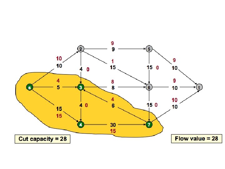 Max Flow Network Max flow network: G = (V, E, s, t, u). – (V, E) = directed graph, no parallel arcs. – Two distinguished nodes: s = source, t = sink. – c(e) = capacity of arc e. 10 s Capacity 5 15 2 9 5 4 15 15 10 3 8 6 10 4 6 15 10 4 30 7 t