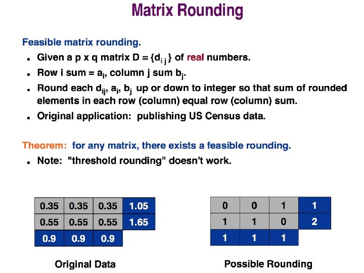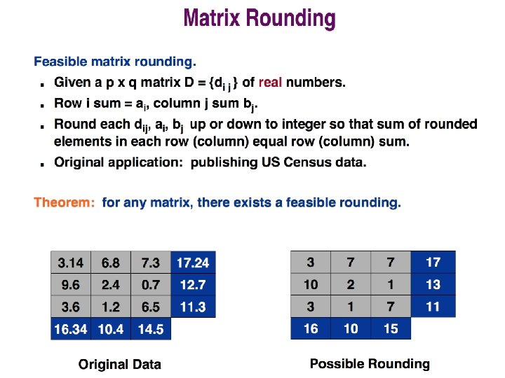 History Year Discoverer Method Big-Oh 1951 Dantzig Simplex mn 2 U 1955 Ford, Fulkerson Augmenting path mn. U 1970 Edmonds-Karp Shortest path m 2 n 1970 Dinitz Shortest path mn 2 1972 Edmonds-Karp, Dinitz Capacity scaling m 2 log U 1973 Dinitz-Gabow Capacity scaling mn log U 1974 Karzanov Preflow-push n 3 1983 Sleator-Tarjan Dynamic trees mn log n 1986 Goldberg-Tarjan FIFO preflow-push mn log (n 2 / m) . . . Length function m 3/2 log (n 2 / m) log U mn 2/3 log (n 2 / m) log U 1997 Goldberg-Rao
