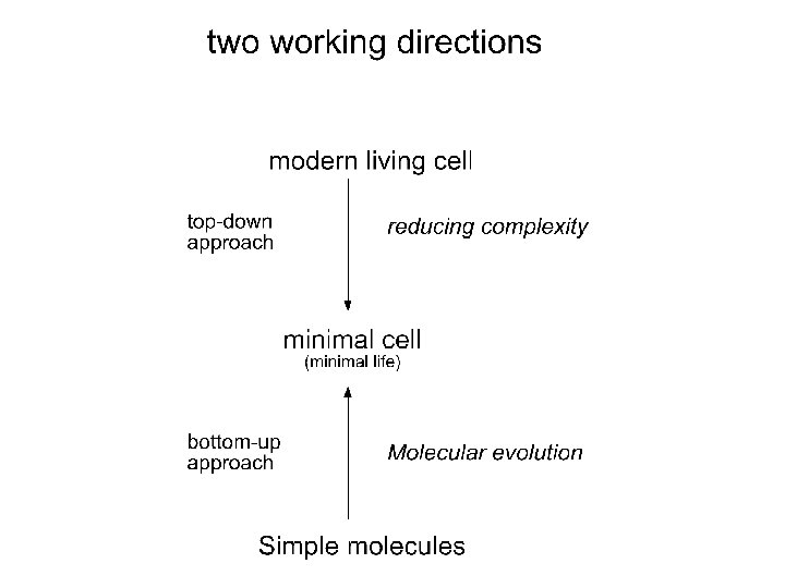 AS A WAY OF CONCLUSION CONCERNING THE TRANSITION TO LIFE FROM THE INANIMATE MATTER: 1. IT HAS NOT BEEN IMPLEMENTED IN THE LAB YET. THEREFORE, IT REMAINS AN HYPOTHESIS. AND THE BOTTOM UP APPROACH SEEMS TO BE MADE IMPOSSIBLE BY THE LAWS OF CONTINGENCYCONCEPTUALLY AND EXPERIMENTALLY 2. THE CONSTRUCTION OF SYNTHETIC LIVING CELLS APPEARS POSSIBLE USING EXTANT MACROMOLECULES. MOST SCIENTISTS BELIEVE, THAT „SOON“, THIS WILL BE REALIZED.