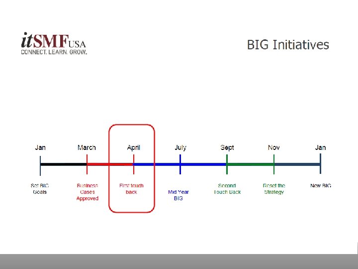 ITSM Focus on Meaningful Capability As processes are improved through CSIP and grow in maturity, subsequent processes will be better enabled, adopted, and improved. The result is a cumulative improvement in overall process maturity, service delivery, and alignment with the business. This maturation is proportional to the commitment Of management and the dedication to CSIP. CMMI / Maturity 5 4 3 2 Change Configuration Incident Request Problem 1 Service Level Time / Maturity • Capacity • Availability • Continuity