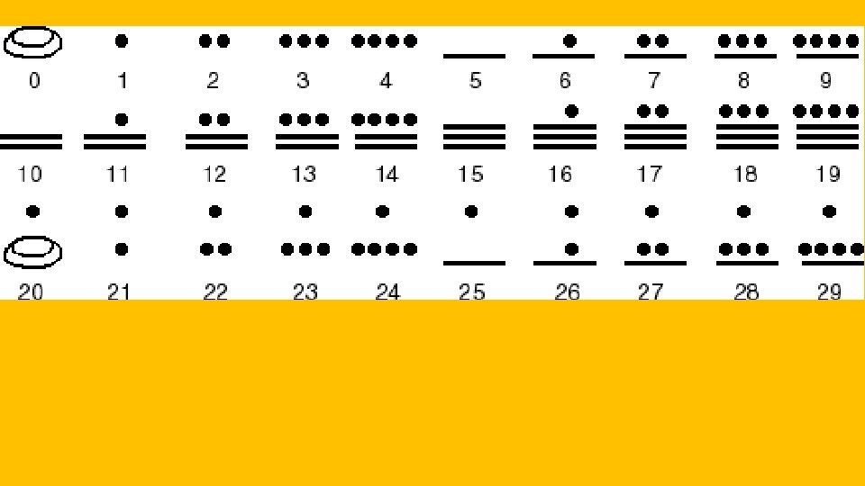 • Mathematics: Instead of ten digits like we have today, the Maya used a base number of twenty. They also used a system of bar and dot as “shorthand” for counting. A dot stood for one and a bar stood for five. • Calendar: A Mayan Calendar: the 20 months of circle on the right fit together with the days of each month, shown by the circle on the left. • Writing: Mayan hieroglyphic writing is made up of symbols that represent whole words or syllables consisting of constant vowel pairs (cv) or vowels. It is the only writing system of the Pre-Columbian New World which is known to completely represent the spoken language of its community. In total, the script has more than a thousand different glyphs, although a few are variations of the same sign or meaning, and many appear only rarely or are confined to particular localities.