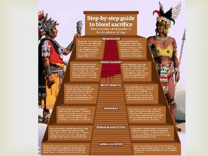 B. R-Religion-worshipped many gods with bloodletting or human sacrifices 1. Believed gods could be harmful and spiteful so to make them happy they offered them blood or scarifices 2. They pierced their ears, nose and tongue to prevent disasters and offered human scrifices for religious holidays 3. Believed dead became one with the gods 4. Temples and pyramids were made to be closer to the gods