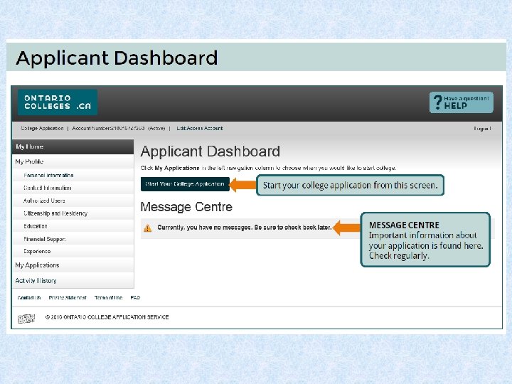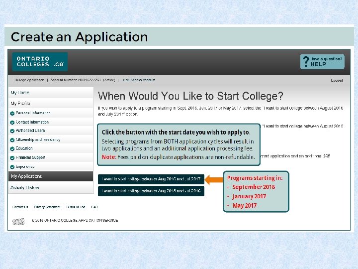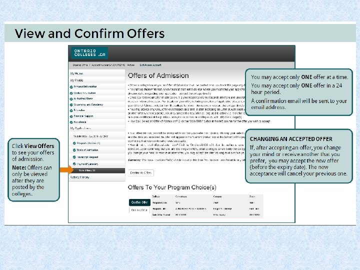 Important Dates: February 1, 2016 All applications received by this date will be given equal consideration by the colleges. This is also the earliest date the colleges will issue an offer of acceptance and the earliest date an applicant may confirm an offer. May 1, 2016 Applicants must confirm their acceptance of an offer of admission by this date. (Note: Offers may be issued after this date, check your offer letter for details. ) June 15, 2016 Earliest date colleges may require tuition. Make course changes for Semester 2 by December 18 th, 2015 You may want to print off a checklist to help you. Go to: ontariocolleges. ca/ apply