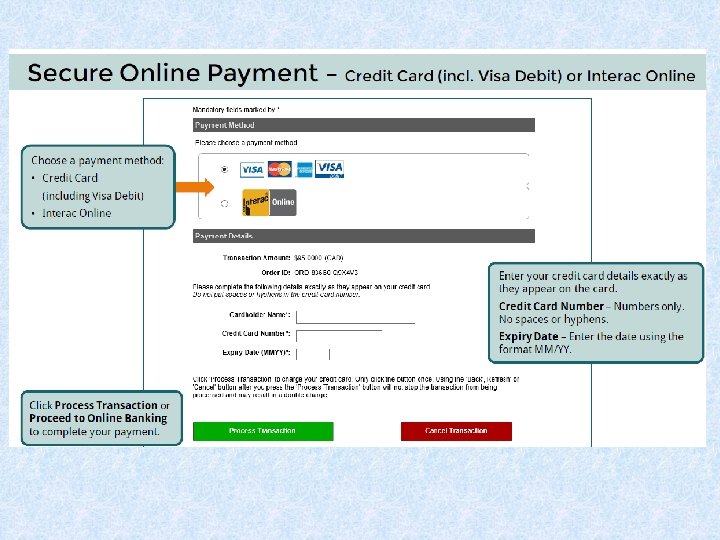 Methods of Payment • Payment for online applications is accepted by: • Credit card (VISA, Master. Card or American Express). Prepaid credit cards and VISA debit cards are not accepted. • Online banking (Canadian banks and credit unions only). Normally takes 1 -3 business days. • All payments must be made in Canadian funds.
