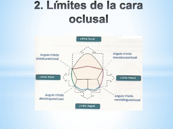 Límite Características Bucal Brazo distal de cúspide bucal la Corre del ángulo D. B. O. a la cima de la cúspide. Es recto. Mesial Prominencia transversal De la cima de la cúspide a la parte media de la línea segmental central. Es recta. Distal Surco D. B. Del ángulo D. B. O. a la parte terminal D. de la línea segmantal central. Es recta. Lingual Mitad D. de la línea De la terminación distal de la segmental central línea segmantal central a la mitad de ésta.