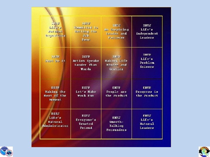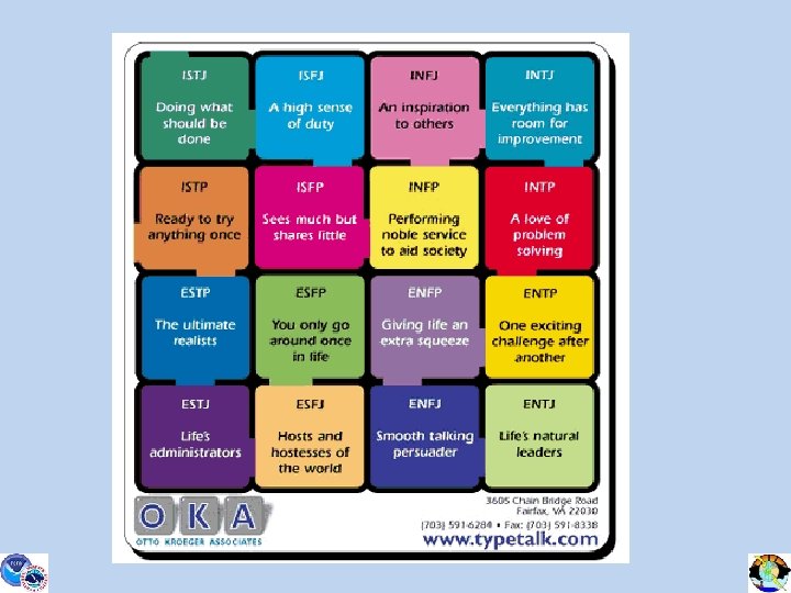 Quick on-line tools • Prerequisite: Complete the on-line tool and print out the results page (which defines your type e. g. INFP) • http: //similarminds. com/jung. html • Resource for many on-line personality tests… http: //similarminds. com/personality_tests. html
