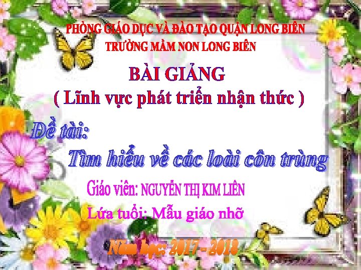 Mục đích – Yêu cầu Sau khi học xong bài này trẻ sẽ có được: 1. Kiến thức: - Trẻ nêu được đặc điểm, cấu tạo của các loài côn trùng. - Trẻ mô tả được quá trình sinh trưởng và phát triển của các loài côn trùng - Trẻ hiểu được công việc hàng ngày và lợi ích của các loài côn trùng. 2. Kỹ năng: -Trẻ có kỹ năng trả lời các câu hỏi của cô đầy đủ, rõ ràng, mạch lạc - Rèn trẻ khả năng ghi nhớ, chú ý có chủ định - Trẻ biết sử dụng máy tính để chơi trò chơi. 3. Thái độ: -Trẻ tập trung chú ý vào giờ học. Biết kết hợp với bạn để chơi trò chơi - Trẻ hứng thú với những hình ảnh thật và sống động trong bài giảng của cô.