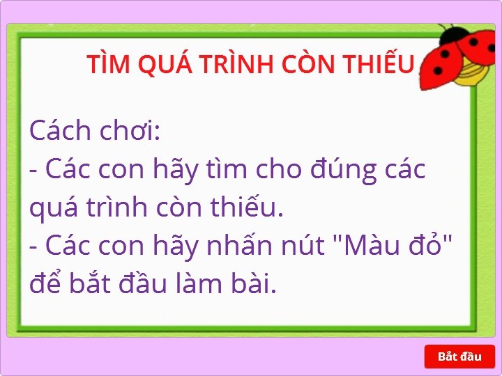 Cách tiến hành 1. Ổn định tổ chức: - Cô và trẻ cùng hát bài hát “Chị Ong nâu và em bé”. 2. Phương pháp, hình thức tổ chức: - Tìm hiểu về các loại côn trùng - Trẻ về ngồi hình chữ U và quan sát trên màn hình - Cô đưa ra các câu hỏi theo nội dung bài dạy để trẻ trả lời 3. Trò chơi ôn luyện: * Trò chơi 1: “Thi xem ai nhanh” - Cách chơi: Cô gọi tên – Trẻ giơ lô tô theo yêu cầu của cô. * Trò chơi 2: “Tìm quá trình còn thiếu” - Cách chơi: Tìm đúng quá trình còn thiếu trên máy tính.